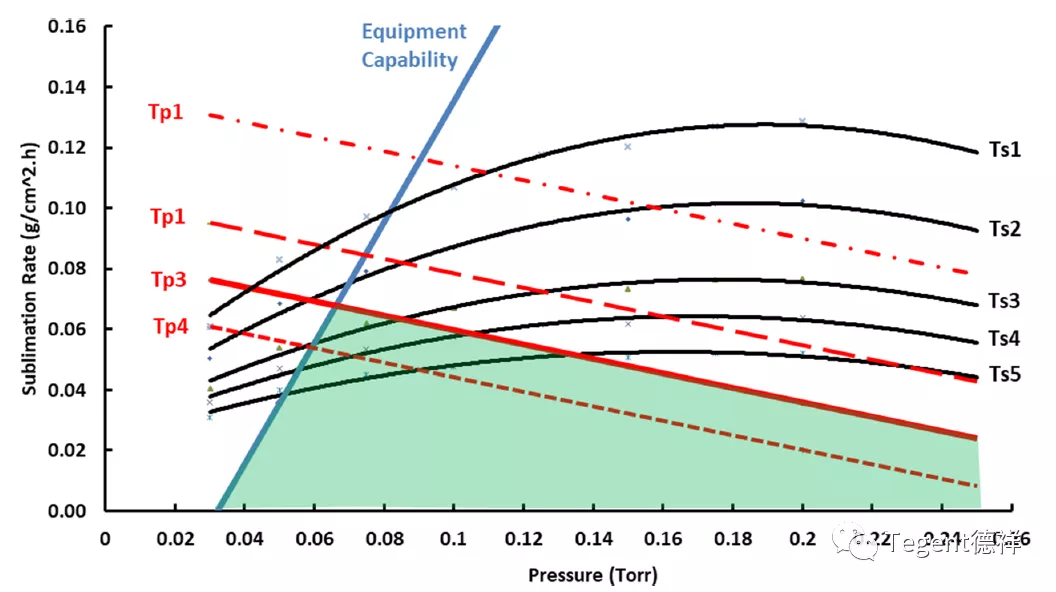 冷凍干燥是注射藥物制造中非常重要的環(huán)節(jié),但該過程效率往往非常低,很多情況下一個凍干循環(huán)耗時會超過數(shù)天。在凍干工藝的開發(fā)過程中使用反復試驗方法通常會使該過程原本的低效率變得更糟,并且開發(fā)出的工藝條件可能遠非最佳——最佳條件被定義為在保證藥物性能和安全的同時最小化工藝需要的時間,并且保證該工藝在生產時也在設備的能力范圍以內。近年來,開始通過應用初級干燥的圖形設計空間理念,確定初級干燥的最佳條件。代表性的設計空間如圖 1 所示,y 軸為升華速率,x 軸為凍干機腔體壓力。