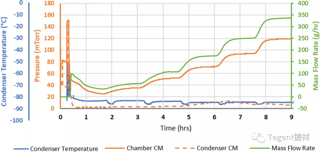 ▲ 圖3:干燥過程中的數(shù)據(jù)用于繪制隨時間變化的壓力和質量流量的關系圖。腔室壓力與冷凝器壓力的比率范圍從大約 8:1 到高達 20:1