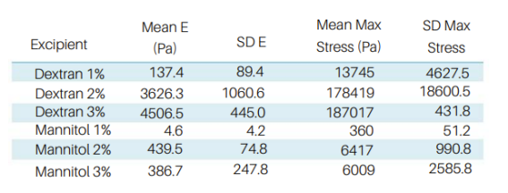 甘露醇的濃度從1%增加到2%的過程中,楊氏模量(Youngs Modulus)從最弱到最強增加了近10倍(圖4左)。但從3%甘露醇的強度并不比2%高 ,相反3%甘露醇凍干餅的平均楊氏模量降低了,但相比2%濃度的標準偏差有所增加,樣本之間的差異變得更大。圖4右顯示提升葡聚糖濃度的結(jié)果是得到了比甘露醇強得多的凍干餅,且葡聚糖的濃度從1%到3%,凍干餅的楊氏模量增加了107%,發(fā)生變形所需的力倍增。由于蛋糕的整體強度超過了MicroPress 的測量范圍,無法確定其能承受的最大應力。然而,這可以通過更小直徑的壓頭來解決,以確保能達到被測量凍干樣品的最大應力。