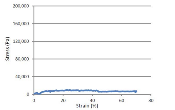 延伸階段以10mm/s的速度將壓頭移動到預估凍干餅高度的5mm以內(nèi);定位階段找到蛋糕的頂部;一旦檢測到頂部,就會開始擠壓凍干餅,然后記錄施加在凍干餅上的力。從圖3(左)可以看出,3%葡聚糖顯示出彈性特性,這個特性由減壓階段從40%應變返回到18%應變的曲線得到證明。