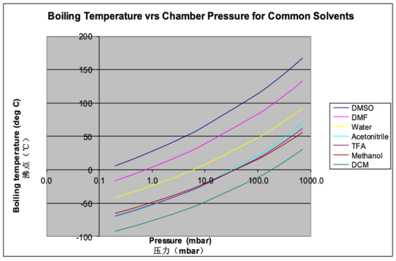 那有沒有一種方法可以高效去除這類高沸點有機溶劑的同時又可以解決以上問題呢?我們知道溶劑的沸點隨著壓力降低而降低,當壓力降到一定程度時,在較低的溫度條件下,溶劑便沸騰蒸發(fā)。既能使高沸點溶劑得已去除,又可在保證較低的溫度對樣品進行保護。如DMSO在1mbar的真空度條件下溶劑的沸點降至25℃。