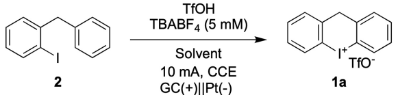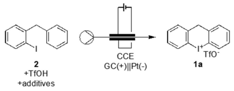 在分批條件下電化學氧化和環(huán)化中間體碘油烯,通過初步觀察,確定三氟甲磺酸適合環(huán)化并作為抗衡離子。