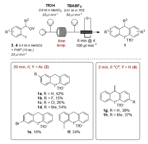 開發(fā)了第一個多步連續(xù)流動程序,用于生成環(huán)狀六元二芳基碘鎓鹽; |