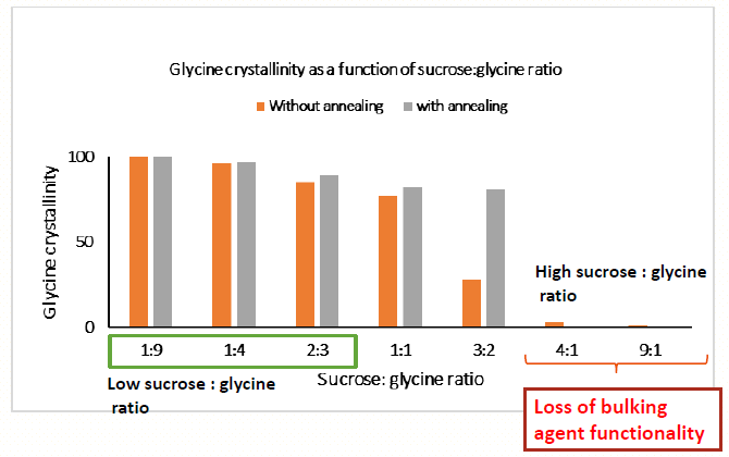 實驗通過將蔗糖和甘氨酸以不同比例(從1:9到9:1)溶解于水中,分別在15℃退火1h 和不進行退火,凍干后樣品通過近紅外光譜測定甘氨酸的結晶度。觀察到當蔗糖:甘氨酸>4時,甘氨酸失去了其填充劑的功能(Bai et al., J Pharm. Sci. 2004)。