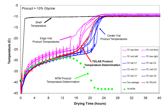 該圖顯示了基于中心的小瓶和邊緣的小瓶熱電偶的溫度測量之間的明顯差異,邊緣的小瓶產(chǎn)品溫度高于中心的小瓶,這是由于來自溫暖的干燥器壁和門的輻射熱負荷。TDLAS確定的批次平均產(chǎn)品溫度,最初偏向于在早期的一次干燥中熱電偶測量的中心瓶,因為最初有更多的“中心瓶”,相比在一次干燥后期的“邊緣瓶”,然后提供一次干燥后期邊緣瓶和中心瓶之間的平均測定值。