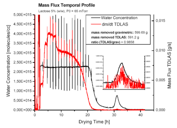 圖3顯示了具有代表性的TDLAS水濃度測量和質(zhì)量流量測定,是在Lyostar冷凍干燥機中干燥5%乳糖配方的過程中進行測定的。