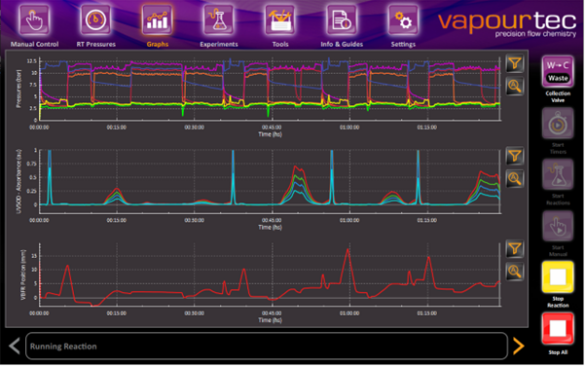 Vapourtec R系列的軟件可以用于程序反應(yīng)和收集穩(wěn)態(tài)數(shù)據(jù),同時提供實時數(shù)據(jù),可用于評估反應(yīng)效率。例如,使用R-Series軟件,用戶可以在一個屏幕上查看泵性能、在線分析、溫度等更多信息,如電化學(xué)中的電流和電壓或肽合成中的反應(yīng)器體積變化等。