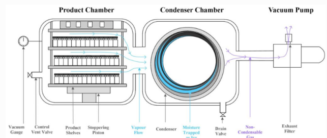 冷凍干燥的原理涉及以受控方式對產(chǎn)品進行初始冷凍,以控制冰晶結(jié)構(gòu)。 然后將其置于真空中,在真空中進行升華(或初步干燥)以去除未結(jié)合的水。接下來是二次干燥以升華結(jié)合水,將材料降至用戶定義的殘留水分水平。此階段的目標(biāo)是結(jié)合水而不是未結(jié)合/游離水,因此需要更多的能量來通過將擱板溫度提高到+20°C或更高來驅(qū)動該過程。當(dāng)加上低氣壓時,它會導(dǎo)致冰直接變成水蒸氣(通過液相),這個過程叫做升華。