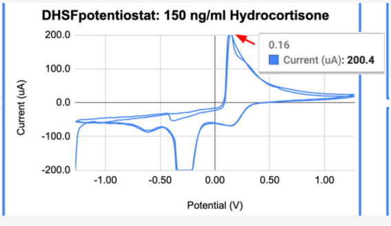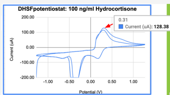 以下是三張具有代表性的人工汗液測試溶液的數(shù)據(jù)圖(由Pickering實驗室提供的人工汗液測試)。他們表明,Margaret開發(fā)的汗液皮質(zhì)醇生物傳感器可以檢測皮質(zhì)醇標準,皮質(zhì)醇濃度水平與當(dāng)前峰值之間存在正相關(guān)。