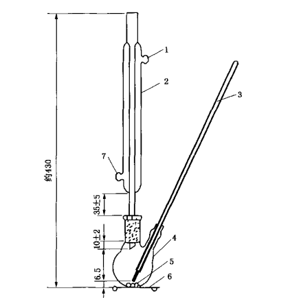 1-排水口;2-冷凝管;3-溫度計;4-燒瓶;5-沸石;6-石棉金屬網;7-進水口