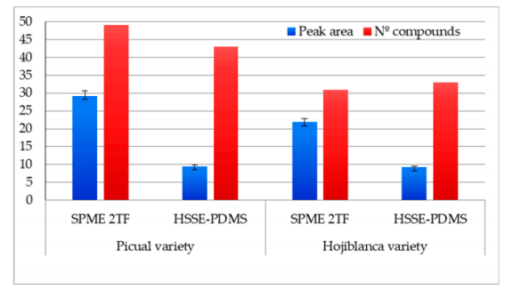 在Picual品種EVOO中,用2TF-SPME和hsse - pdms分別測定了49個和43個化合物)。在Hojiblanca品種EVOO中,HSSE-PDMS提取的化合物數(shù)量(34)與2TF-SPME(32)相似。然而,在這兩種情況下,使用2TF-SPME方法獲得的總面積值最高(如圖1所示)。