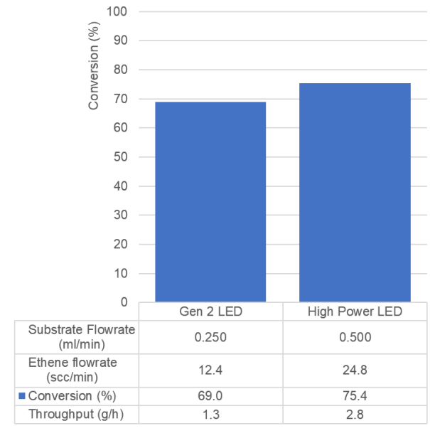 圖5總結(jié)了反應條件以及結(jié)果,在使用高功率LED時,實現(xiàn)了2.8 g/h的產(chǎn)量。