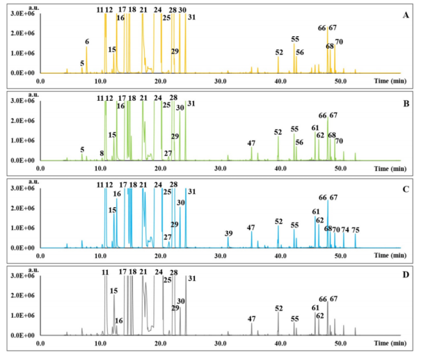 盡管從譜圖中可以看到四個(gè)檸檬樣品的VOCs分布明顯相似,但與各VOC和功能群的相對豐度有關(guān)的一些特征是特別的。