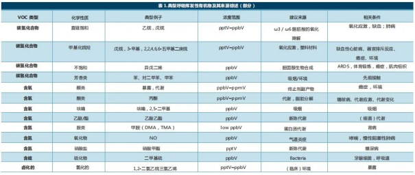 表1:在人類呼吸中檢測(cè)到的典型揮發(fā)性有機(jī)化合物和建議的來(lái)源