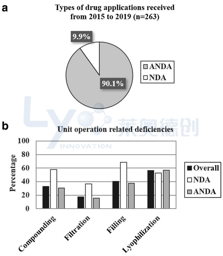 圖1:展示的在本研究中調(diào)查的263個監(jiān)管提交中包括原始申請和修訂申請。對相應(yīng)監(jiān)管提交觀察到的與制造相關(guān)的缺陷(即263次提交約占83%,包括199個ANDA和19個NDA)均被歸類為凍干注射劑產(chǎn)品所需的單元操作。提交中多個單元操作觀察到的缺陷所占百分比總和超過100。