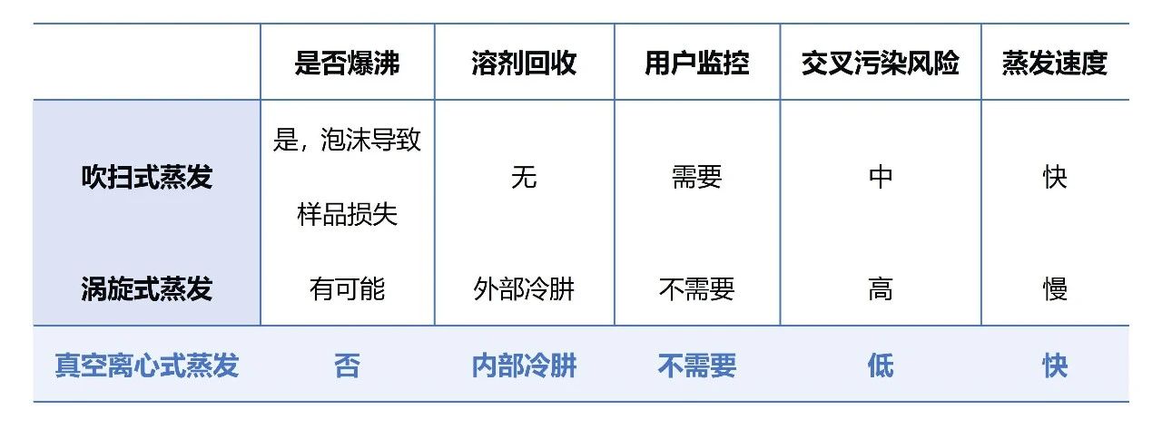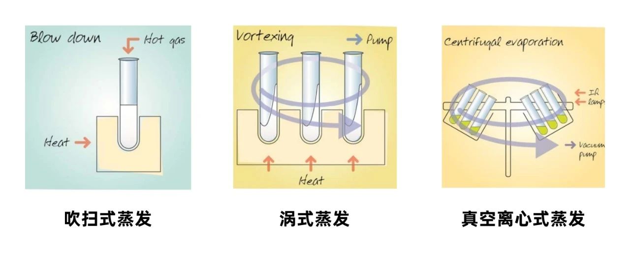 在樣品制備方法的蒸發(fā)部分傳統(tǒng)上依賴(lài)于使用旋轉(zhuǎn)蒸發(fā)器,然而,它有許多操作缺陷。最大的缺點(diǎn)是旋轉(zhuǎn)蒸發(fā)器是一個(gè)單樣品系統(tǒng),需要連續(xù)監(jiān)測(cè)以控制過(guò)程并確保不發(fā)生起泡或暴沸。硝基呋喃樣品通常以批次多樣品的形式送達(dá)實(shí)驗(yàn)室,如果使用旋轉(zhuǎn)蒸發(fā)器可以在有限的時(shí)間內(nèi)處理小批量樣品,那么處理大批量樣品時(shí)很快就會(huì)變得無(wú)法處理。因此,實(shí)驗(yàn)人員針對(duì)吹掃式蒸發(fā)、渦式蒸發(fā)及真空離心式蒸發(fā)三種方式進(jìn)行考察,結(jié)果如下: