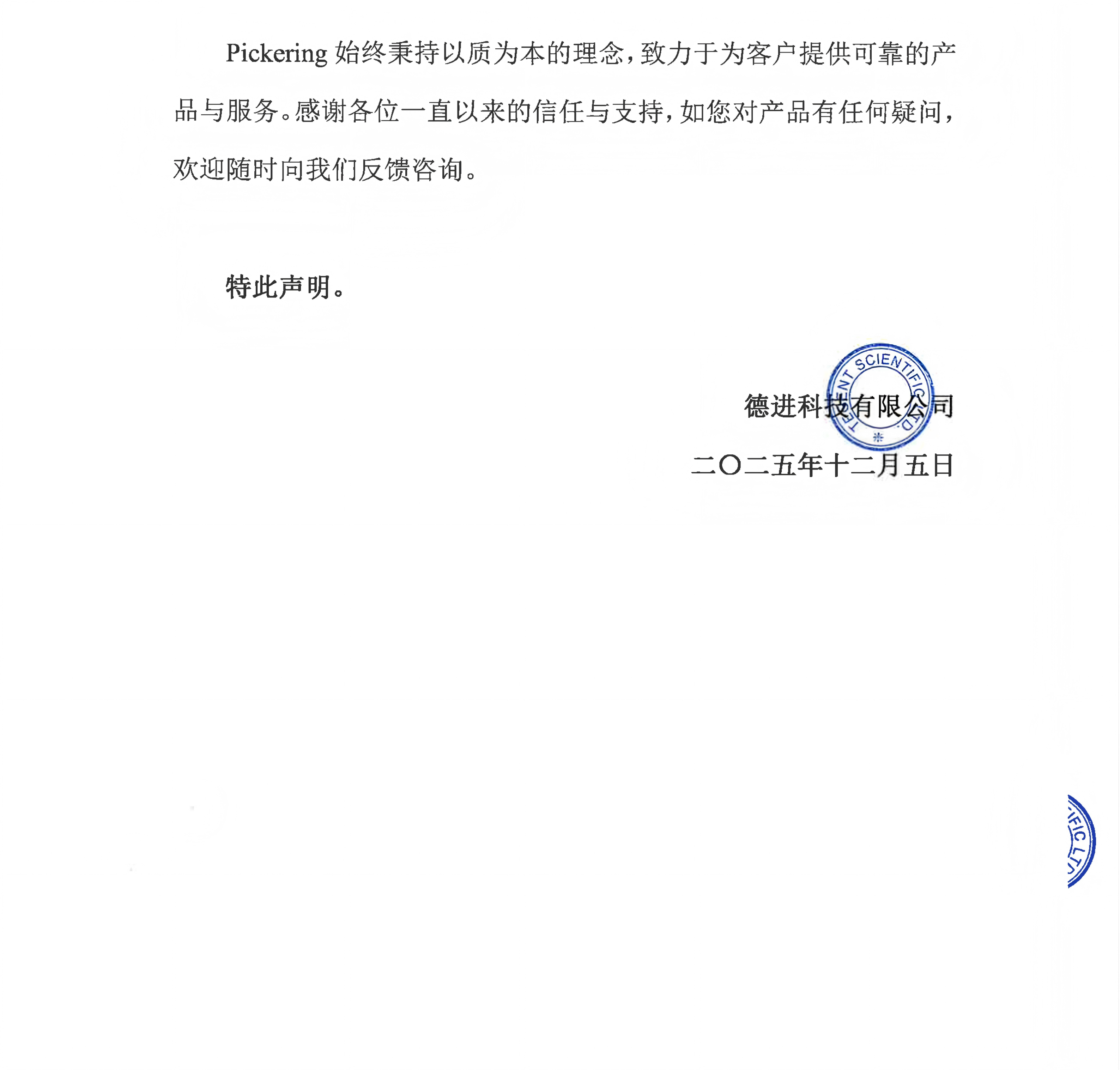 Pickering是德祥集團(tuán)資 深合作伙伴之一。美國(guó)Pickering Laboratories公司是一家全球?qū)I(yè)提供人工測(cè)試體液和柱后衍生化學(xué)試劑、色譜柱、分析方法等柱后衍生分析整體解決方案的機(jī)構(gòu),其不斷創(chuàng)新及良好的信譽(yù)被眾多的美國(guó)政府機(jī)構(gòu)如EPA、ATF、FDA、AOAC和世界著 名的廠商所認(rèn)可。