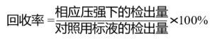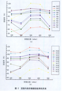 從圖2可看出,標(biāo)準(zhǔn)列出的有害芳香胺的回收率與壓強(qiáng)之間關(guān)系的變化規(guī)律比較一致。壓強(qiáng)在300 mbar和400 mbar時回收率最理想,壓強(qiáng)較低或較高時,回收率都較低,這主要由于芳香胺的回收率既受溶劑的蒸發(fā)速度影響也受濃縮時間長短的影響。壓強(qiáng)較低,溶劑的蒸發(fā)速度快會使芳香胺的回收率降低;壓強(qiáng)過高,濃縮時間過長,芳香胺損失增大,回收率相應(yīng)降低。