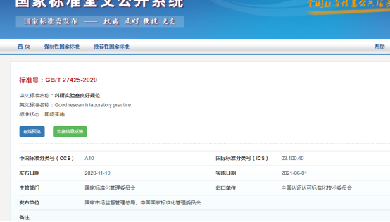 中國國家標(biāo)準(zhǔn)化管理委員會平臺發(fā)布了《科研實驗室良好規(guī)范》(GB/T27425-2020)標(biāo)準(zhǔn),2021年06月01日起實施,此《科研實驗室良好規(guī)范》規(guī)定了科研實驗室良好規(guī)范(簡稱GRLP),包括管理要求和技術(shù)要求,是有關(guān)科研實驗室運行、運行條件以及研究活動的計劃、實施、檢查、記錄、存檔和報告的一套規(guī)范體系,彌補了國內(nèi)科研實驗室良好規(guī)范領(lǐng)域的空白。
